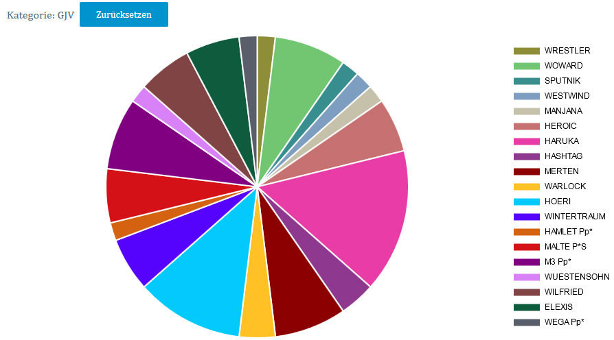 In einer grafischen Darstellung erscheint daraufhin der Einsatz der Bullen der gewählten Kategorie. Auf einem Blick stechen Bullen, die besonders häufig verwendet wurden, heraus. Ziel sollte eine möglichst hohe Streuung beim Bulleneinsatz sein, um das Risiko durch zu hohe Konzentration auf einen Bullen so gering wie möglich zu halten.