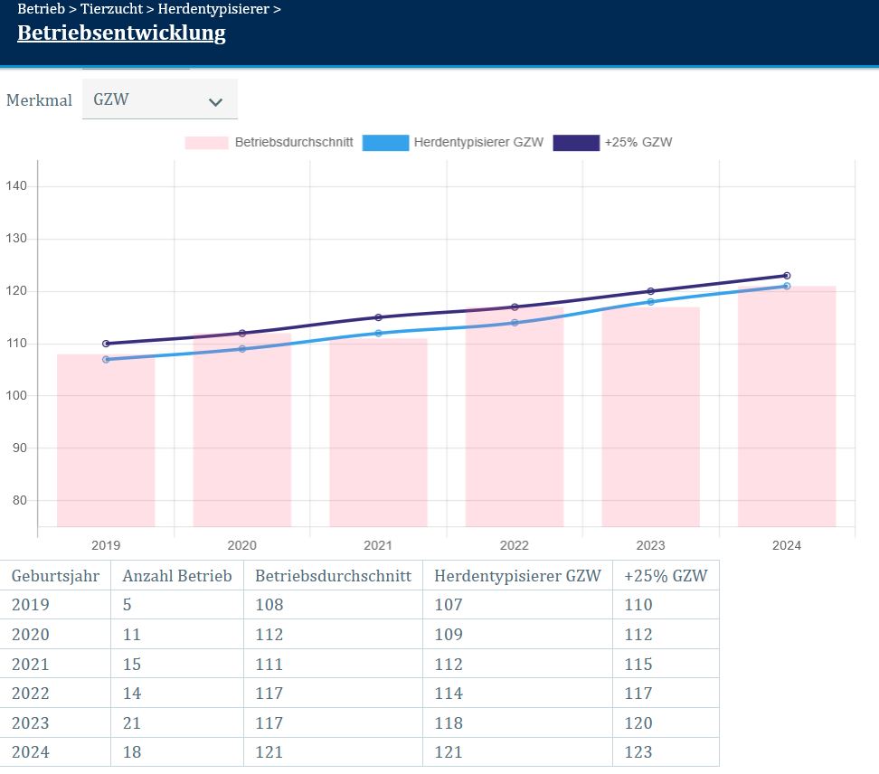 Die Entwicklung der genomischen Zuchtwerte am eigenen Betrieb über die Geburtsjahre hinweg, zeigt die Maske „Betriebsentwicklung“. Ob eine Verbesserung der Werte erreicht werden konnte und wie groß diese war, kann in der Grafik abgelesen werden. Die „Betriebsentwicklung“ liefert Daten für den Gesamtzuchtwert (GZW), den Milchwert (MW), den Fleischwert (FW) und die Fitness (FIT). Beim Fleckvieh steht zusätzlich die Euternote und beim Braunvieh die Gesamtnote im Exterieur zur Auswahl.