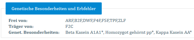 Folgene Erbfehler werden dabei berücksichtigt und, je nach Ergebnis der Zuchtwertschätzung, in den Kategorien 'Frei von' und 'Träger' dargestellt: