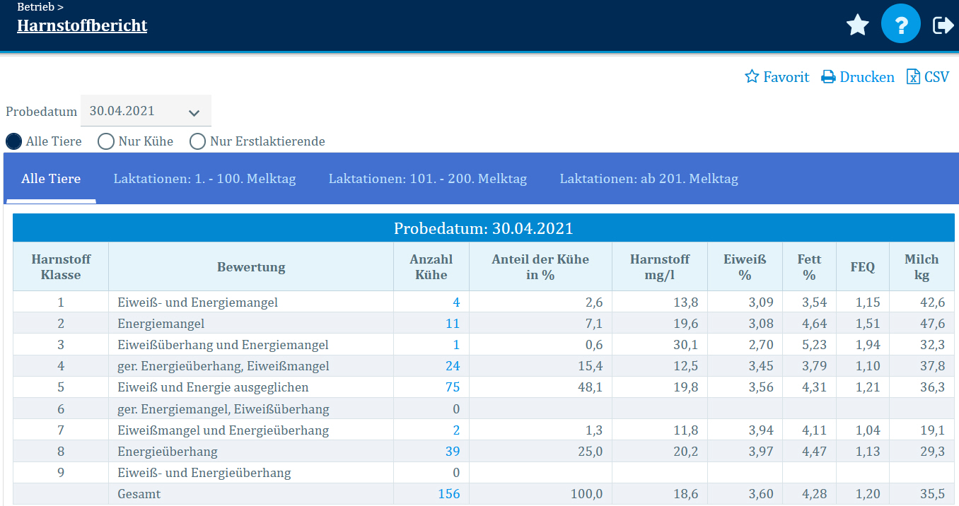 In der Tabelle werden die neun Harnstoffklassen sowie die gesamte Herde mit Ihrer Bewertung aufgeführt.