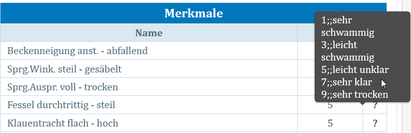 Die Detailansicht der linearen Beschreibungen enthält alle vom Bewerter erfassten Daten. Dabei werden je nach Rasse des Tieres unterschiedliche Merkmale angezeigt. Die Gliederung erfolgt in sechs Kategorien: