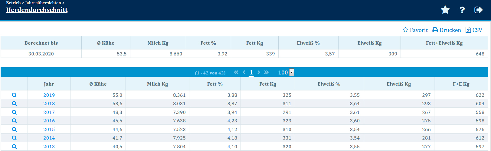 Durch Klicken auf eine der Jahreszahlen in der zweiten Spalte wechseln Sie in die Ansicht Herdendurchschnitt Detail Jahr des gewählten Jahres.