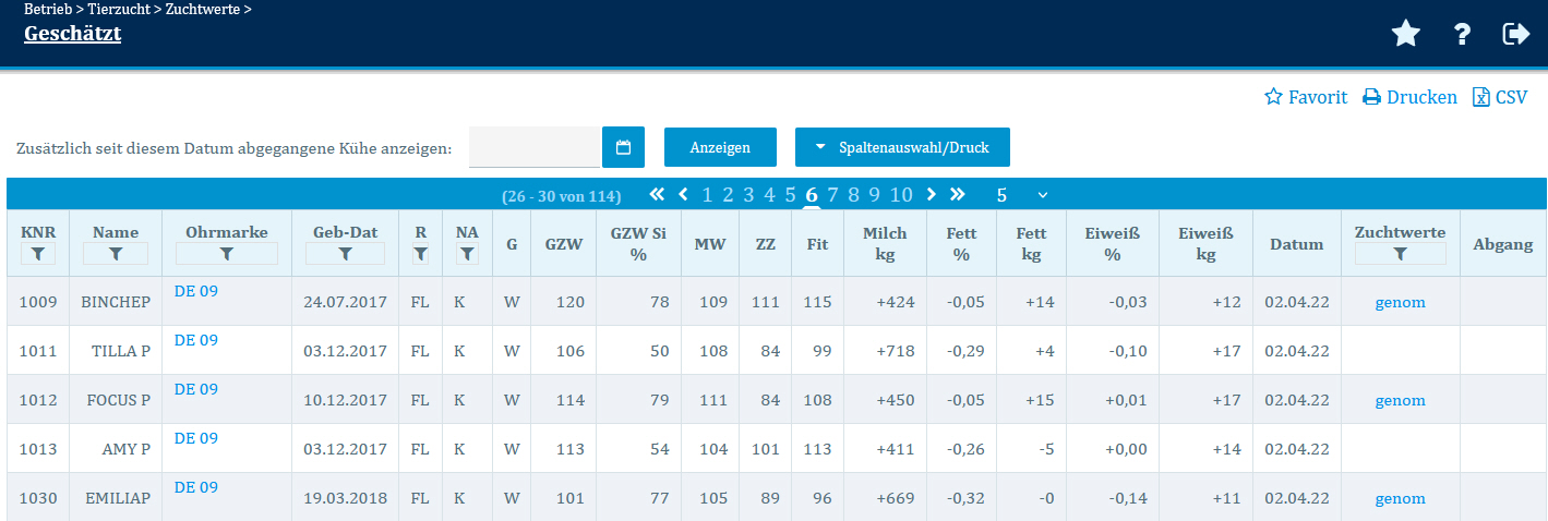 In dieser Ansicht befinden sich die aktuellen Zuchtwerte für alle Kühe und Bullen Ihres Betriebes sowie die genomischen Zuchtwerte bereits typisierter Tiere.