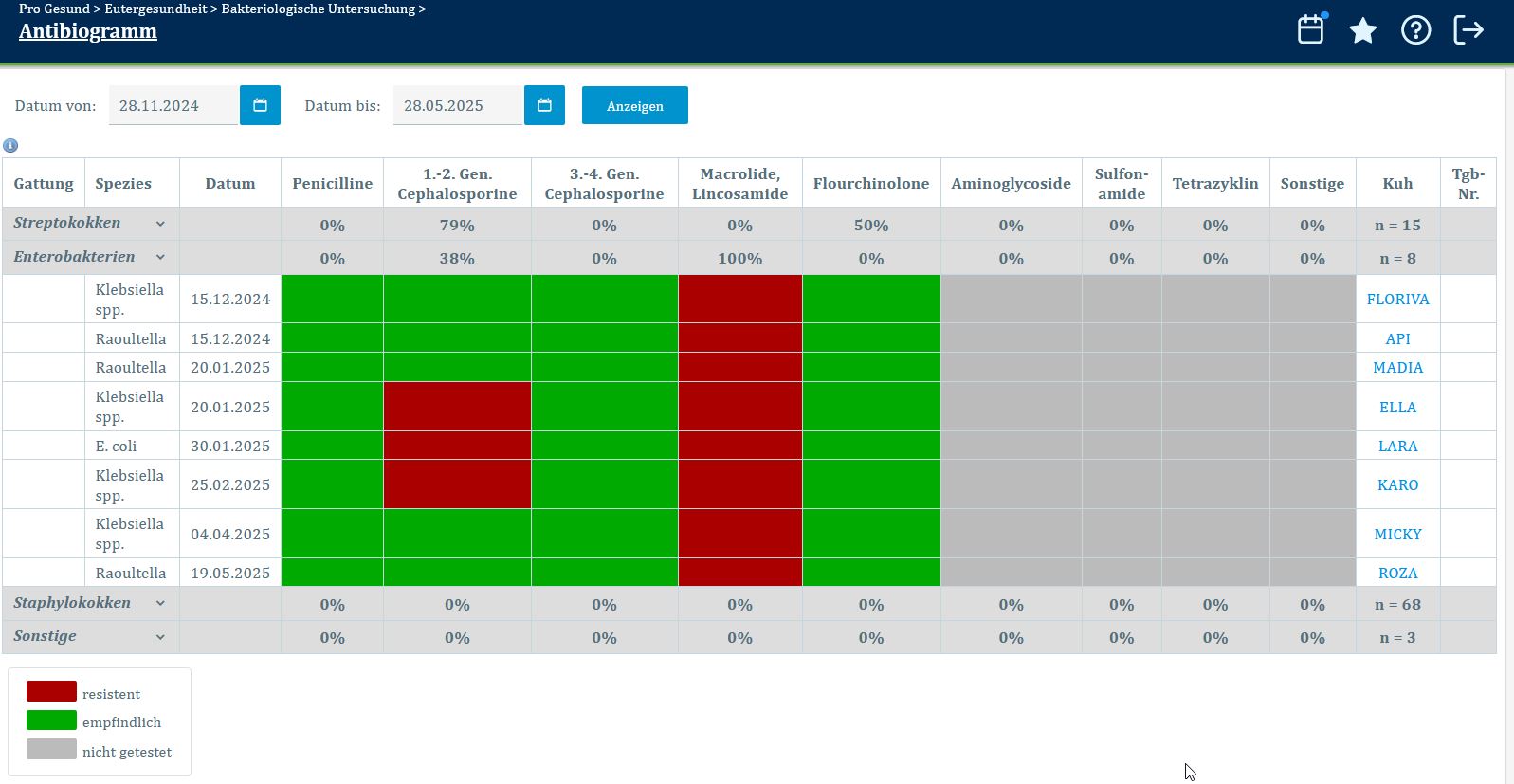 In den Auswertungen der „Bakteriologischen Untersuchungen“ ist die Maske „Antibiogramme“ verfügbar. Darin wird abgebildet, ob die in der untersuchten Milchprobe der Einzeltiere festgestellten Erreger bei bestimmten Antibiotika resistent (rot eingefärbt) oder empfindlich (grün eingefärbt) sind beziehungsweise nicht getestet wurden (grau eingefärbt).