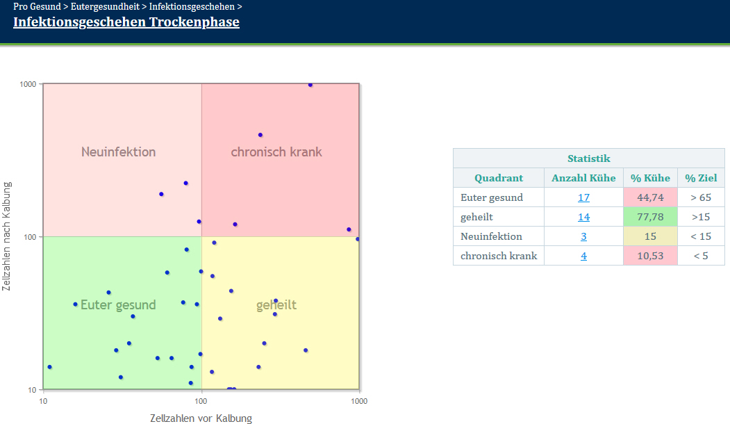 In der Auswertung befinden sich alle Kühe, für die ein Ergebnis zur Zellzahl in der letzten Milchkontrolle vor dem Trockenstellen und in der ersten Probemelkung nach der Trockenperiode vorliegt.