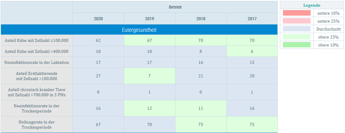 In der Tabelle sind die tierwohlrelevanten Kriterien aufgelistet sowie die betrieblichen Ergebnisse in den einzelnen Kalenderjahren. Die Einfärbung der Zellen erfolgt im Vergleich mit den Werten der Vergleichsgruppe. Die Bedeutung der farbigen Hinterlegung kann aus der Legende neben der Tabelle entnommen werden.