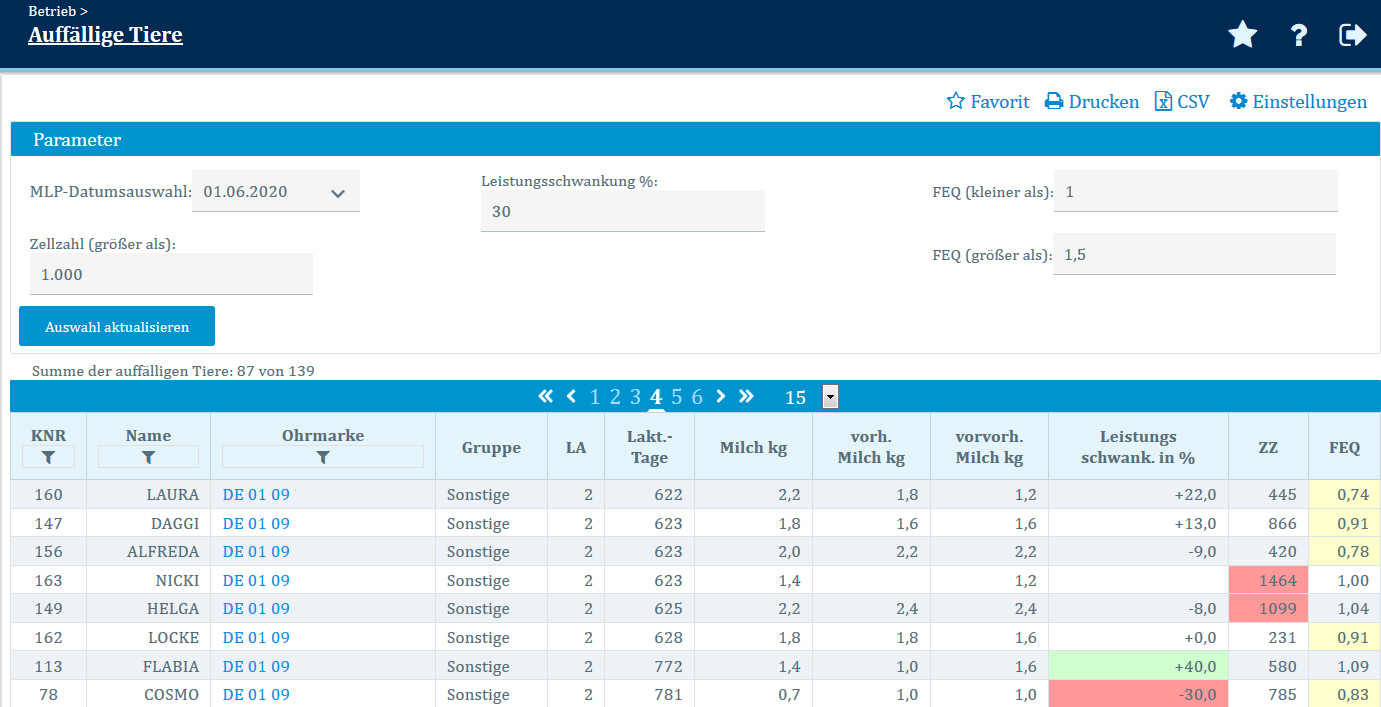 In dieser Ansicht werden alle jeweils für das ausgewählte Probedatum auffälligen Ziegen angezeigt. Das PM-Datum können Sie über das Drop-Down Menü „MLP-Datumsauswahl“ links oben ändern. Das Datum des letzten Probemelken ist darin voreingestellt.