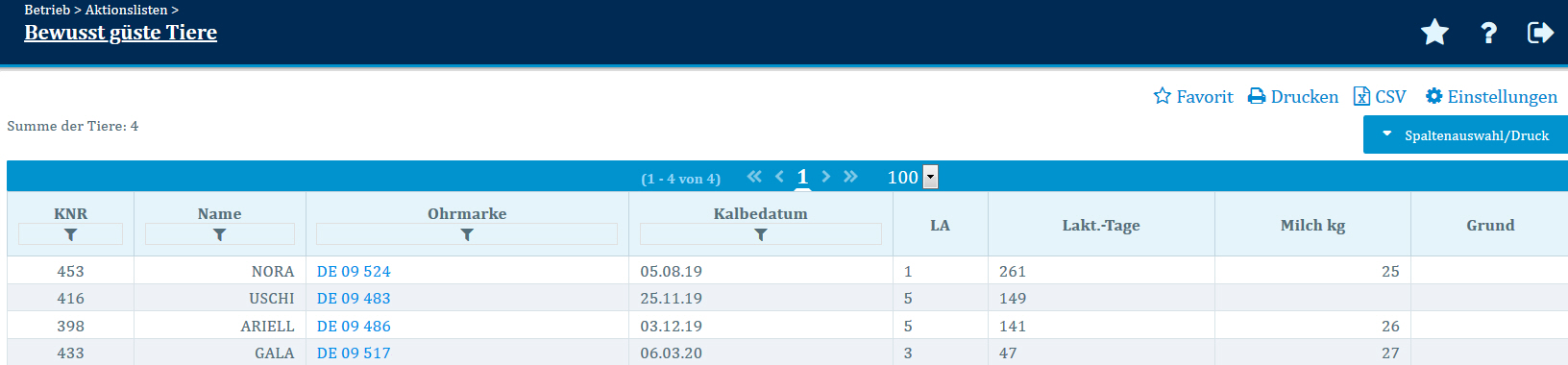 In der Tabelle werden zu Ihren Tieren folgende Daten ausgewiesen: