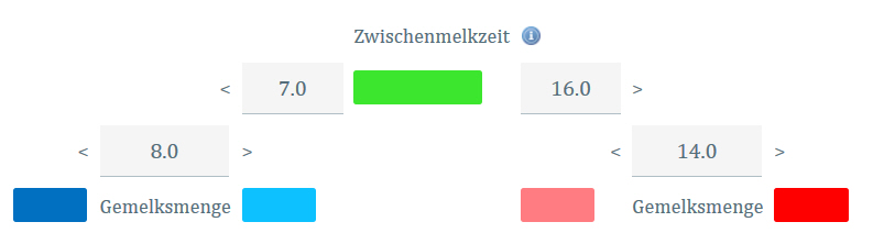 Als Standardwerte für die Zwischenmelkzeiteingrenzung wird eine Zeitspanne von sieben bis sechzehn Stunden verwendet. Alle Zwischengemelkszeiten, die in dieser Zeitspanne liegen, werden grün abgebildet. Kürzere Zwischenmelkzeiten werden in einem Blauton dargestellt, längere Zwischenmelkzeiten in einem Rotton.
