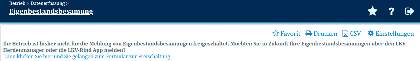 Betriebe, die bisher noch nicht die Vereinbarung zur Erfassung von Eigenbestandsbesamungen unterschrieben haben, können in dieser Maske keine Erfassung von Eigenbestandsbesamungen vornehmen, sondern sich über einen Link das entsprechende Formular herunterladen, ausfüllen und unterschrieben an das LKV Bayern senden.