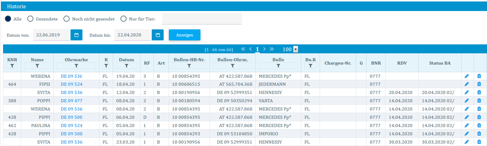 Am Ende jeder Tabellenzeile befindet sich ein Tonnensymbol. Über dieses Tonnensymbol kann die gespeicherte Besamung gelöscht werden. Voraussetzung dafür ist, dass die Besamung noch nicht verarbeitet wurde. Das erkennen Sie daran, dass in den Spalten RDV und Status BA kein Datum eingetragen ist.