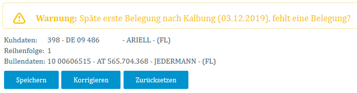 Nach der Erfassung aller Eingaben klicken Sie auf den Button 'Hinzufügen'. Die eingegebenen Daten werden nun zur Überprüfung angeboten und eventuelle Warnmeldungen werden angezeigt. Durch Klicken auf den Button 'Speichern' wird der Datensatz gespeichert. Das Speichern mit der Art „Besamung“ ist bis zu 50 Tagen nach der Besamung möglich, handelt es sich bei der Art um einen „Natursprung“ kann die Meldung bis zu 100 Tage nach dem Natursprung erfolgen.