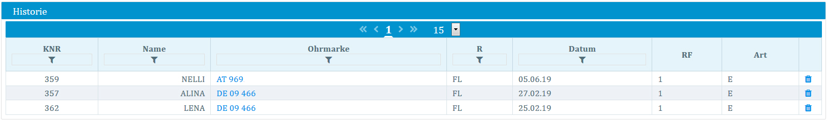 Am Ende jeder Tabellenzeile befindet sich ein Tonnensymbol. Über dieses Tonnensymbol kann die gespeicherte Besamung gelöscht werden.