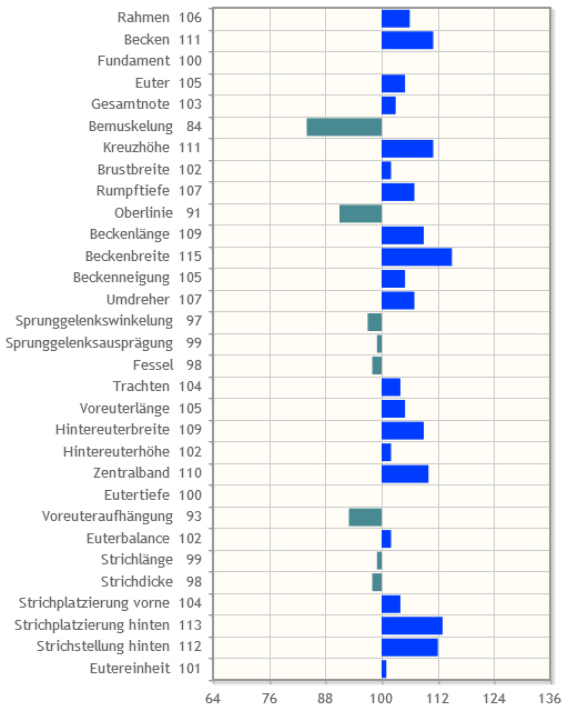 Es werden darin die Exterieurzuchtwerte angezeigt, die über die genomische Zuchtwertschätzung ermittelt wurden. Der absolute Zuchtwert des Einzelmerkmals wird zusammen mit der Bezeichnung am Anfang der Zeile angezeigt (z.B. Rahmen 106). Im Balkendiagramm können dann mit einem Blick die Tendenzen in den Zuchtwerten abgelesen werden.