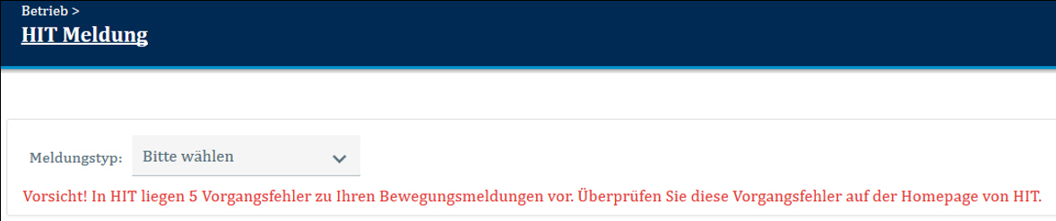 Auf der Einstiegsseite unter der Auswahl des Meldungstypen erfolgt die Anzeige von HIT-Vorgangsfehlern.In roter Schrift werden Sie auf mögliche Fehler Ihrer HIT-Meldungen hingewiesen.