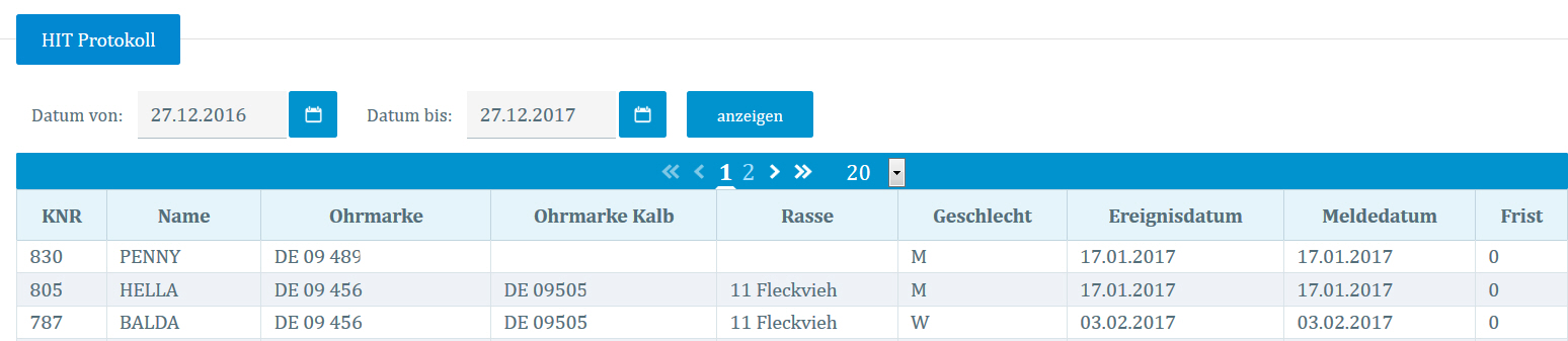 - Kennnummer (KNR), Name und Ohrmarke des Tieres für das eine HIT-Meldung durchgeführt wurde