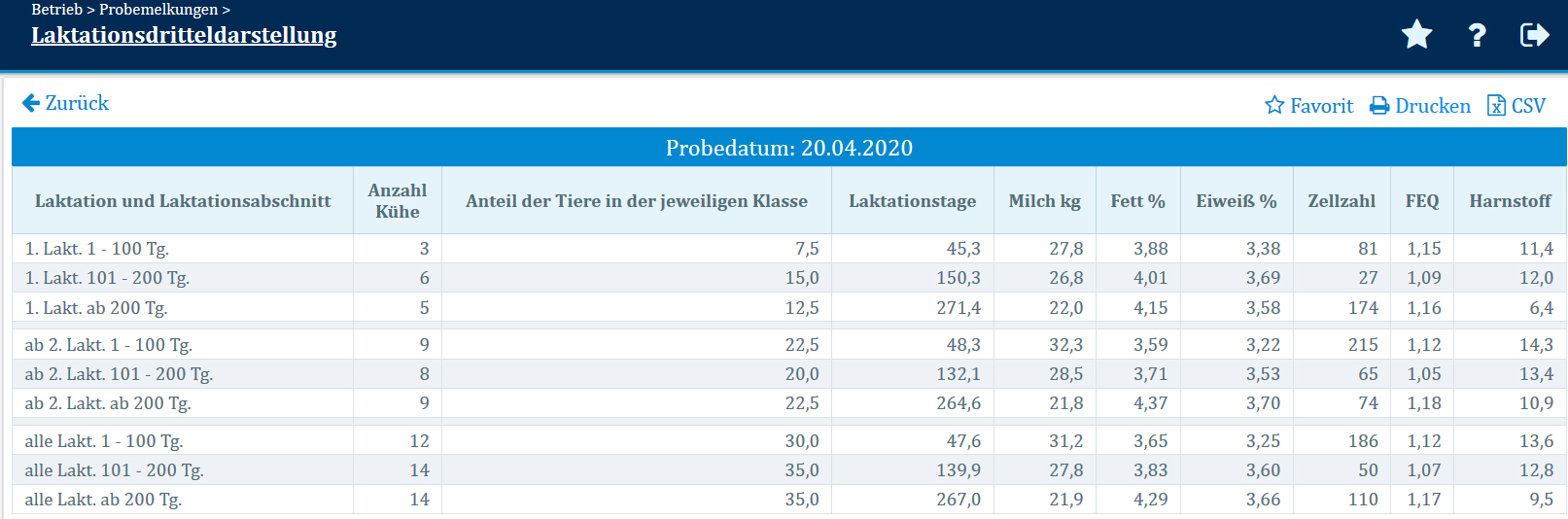 Hier werden die durchschnittlichen Ergebnisse der Kühe nach Laktationsabschnitten angezeigt.