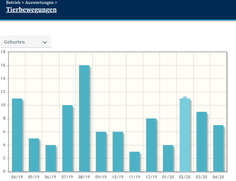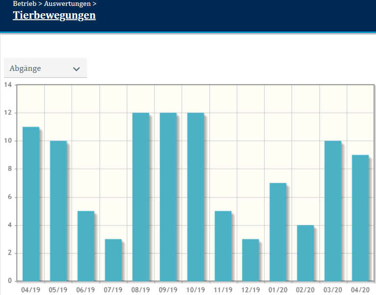 In dieser Auswertung sollen verschiedene Grafiken einen Überblick geben über die betrieblichen Tierbewegungen im Zeitraum eines Jahres.