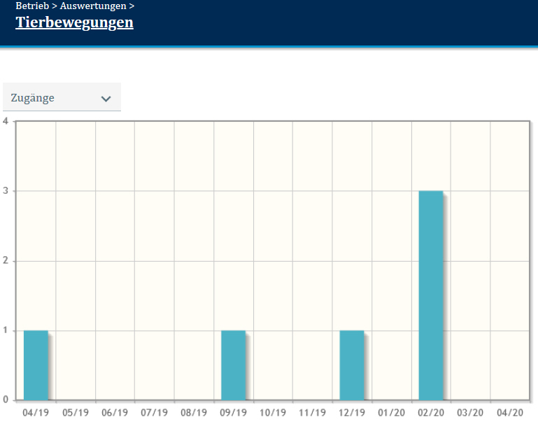 Diese Darstellung soll einen Überblick geben, wie viele Tiere ein Betrieb in den einzelnen Monaten zugekauft hat. Es handelt sich dabei nur um Zukäufe, nicht um Zugänge durch Geburten.