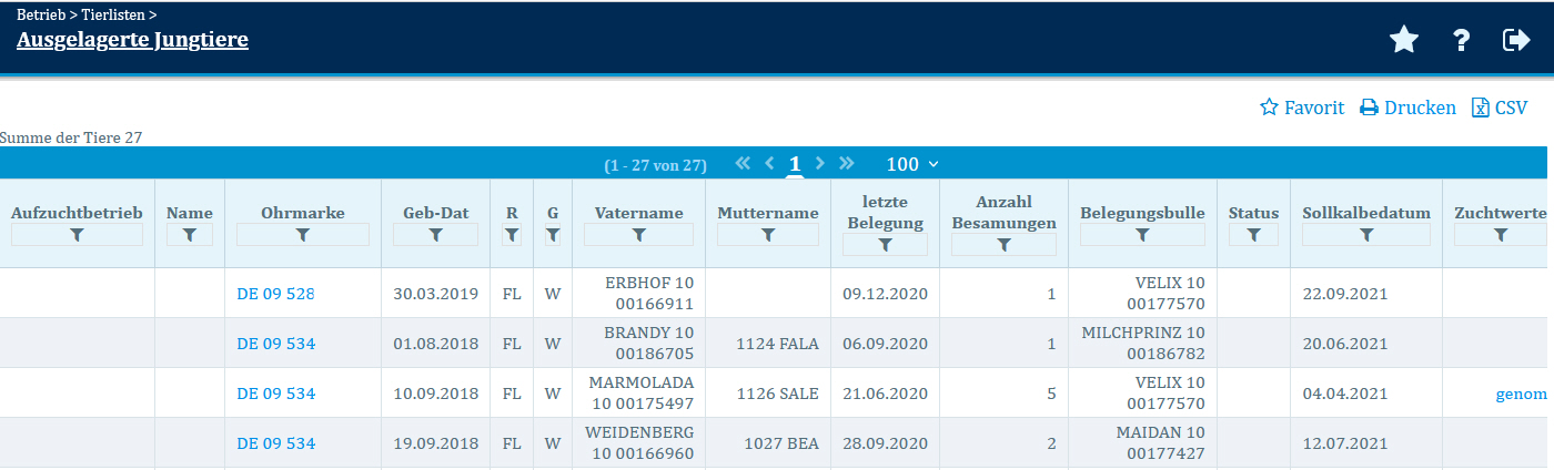 In der Tabelle sehen Sie dann Ihre Aufzuchttiere, die auf dem gemeldeten Auslagerungsbetrieb stehen.