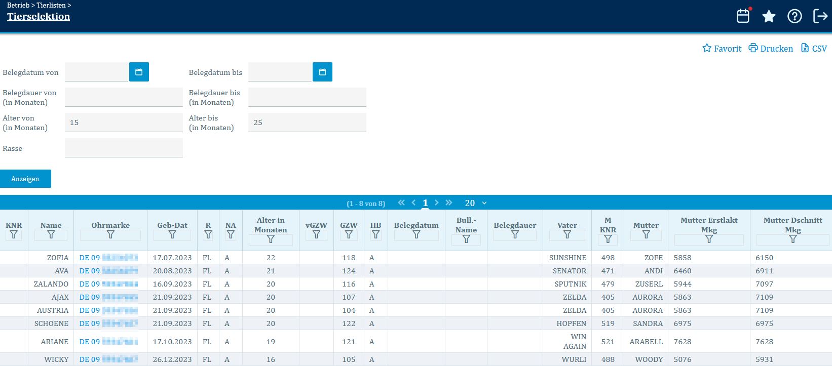 Mit dieser Maske kann aus dem aktuellen Tierbestand eine gezielte und schnelle Übersicht spezielle Tiere erzeugt werden. Durch die Eingabe der gewünschten Filterkriterien in die Selektionsmaske und durch Klicken auf 'Anzeigen' wird die Selektion gestartet.