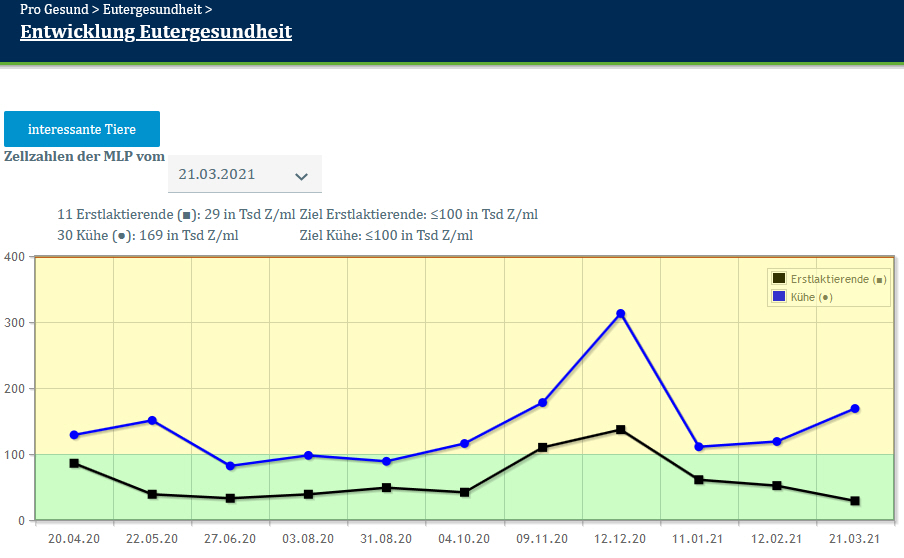 Durch Klicken auf den Button Interessante Tiere wechseln Sie in eine Ansicht zum schnellen Überblick über die Kennzahlen der Eutergesundheit.
