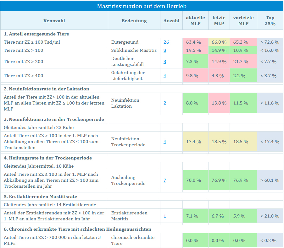 In der Tabelle „Mastitissituation auf dem Betrieb“ finden Sie die wichtigsten Kennzahlen rund um die Eutergesundheit in der Herde.
