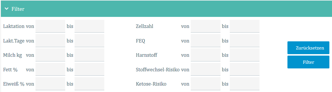 Bei numerischen Spalteninhalten kann nicht nur ein exakter Wert gefiltert werden, sondern auch ein Minimal- oder Maximalwert. Als zusätzliche Eingabe muss in diesem Fall vor dem Filterwert in den Filter die gewünschte Filteranforderung eingetragen werden: < für kleiner, ⇐ für kleiner gleich, > für größer oder >= für größer gleich, z. B. > 1 für Tiere, die bereits mehr als eine Laktation aufweisen.