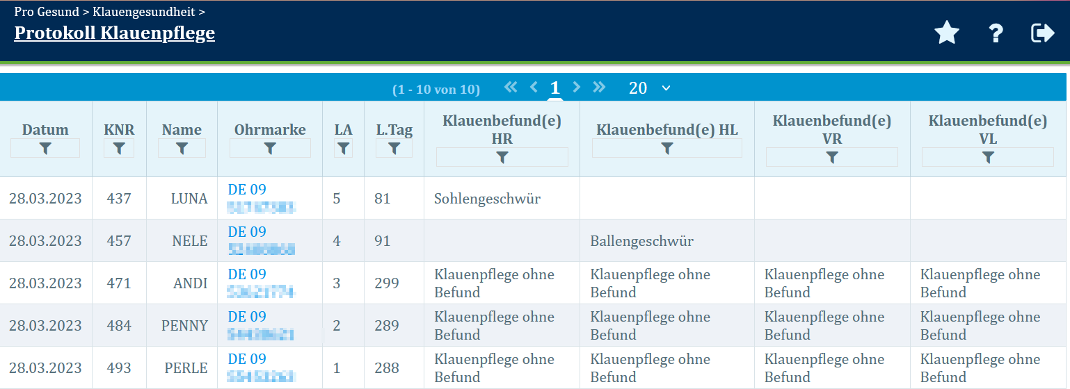 Das „Protokoll Klauenpflege“ gibt eine Übersicht über die durchgeführte Klauenpflege auf Einzelfußebene. Für jeden Klauenpflegetermin können gezielt die Details der festgestellten Klauenbefunde betrachtet werden. Die Auswertung bietet auch die Möglichkeit mehrere Einzeltermine zusammenzufassen und gemeinsam auszuwerten. Die Filterfunkion der Tabelle ermöglicht es in dieser Darstellung außerdem durch die Eingabe von Klauenbefunden zu analysieren, wie häufig auf Einzelfußebene bestimmte Erkrankungen festgestellt wurden.