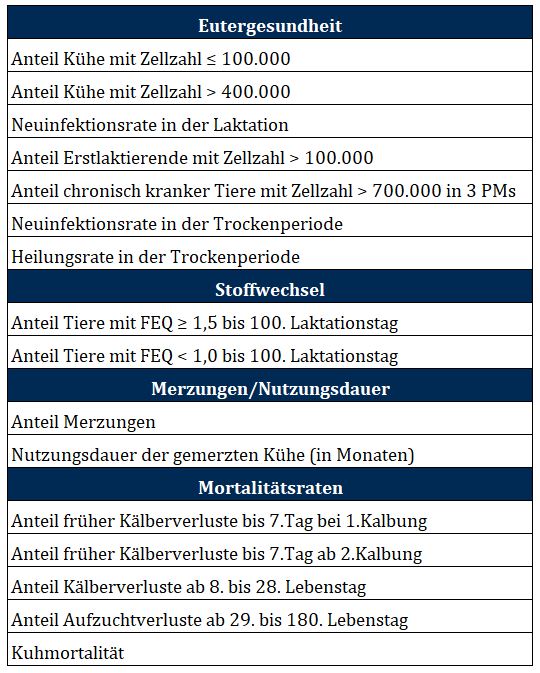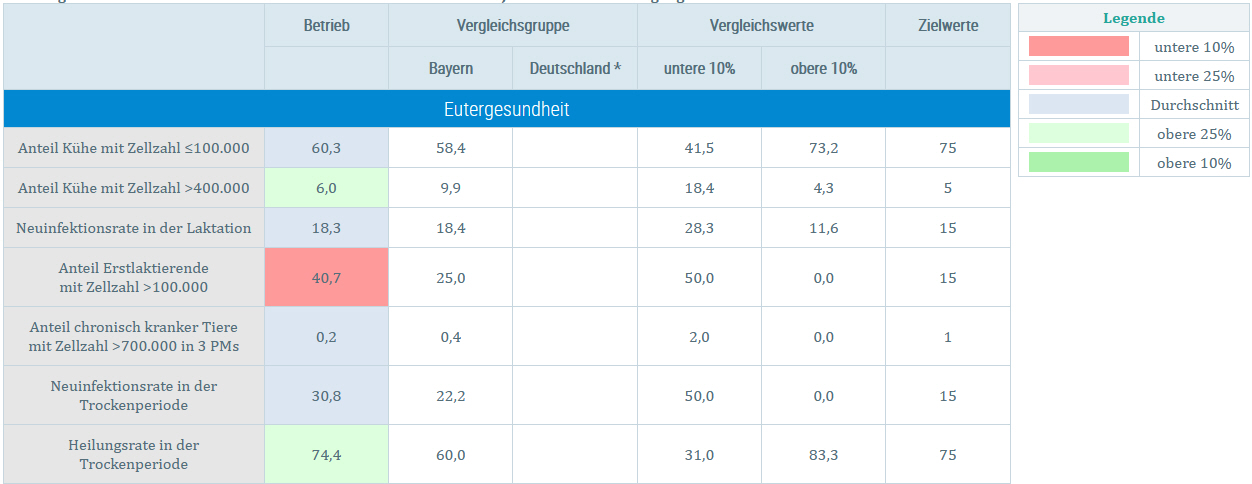 Im 'Herdenvergleich' wird der Betrieb in den tierwohlrelevanten Kriterien tabellarisch mit den Durchschnittswerten aus Bayern und Deutschland verglichen. Zudem erfolgt ein Vergleich mit den Ergebnissen der unteren und oberen 10 % oder wahlweise 25 % der Betriebe. Am Ende der Tabelle wird zudem ein Zielwert für alle Kriterien ausgewiesen. Folgende tierwohlrelevanten Kriterien werden dargestellt: