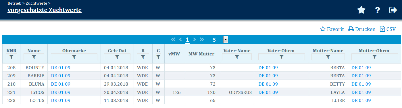 In dieser Ansicht finden Sie die aktuell vorgeschätzten Zuchtwerte für Ihre Tiere aus den Mutter- und Vaterzuchtwerte.